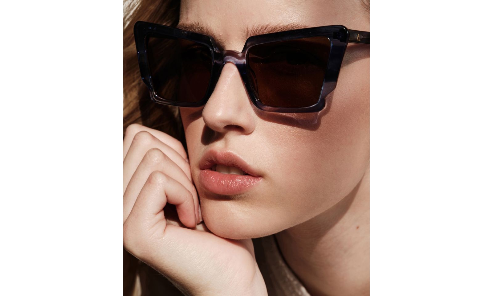 - Γυναικείο γυαλί ηλίου από την ZEUS+DIONE σε σχήμα πεταλούδας με έντονα κοψίματα.