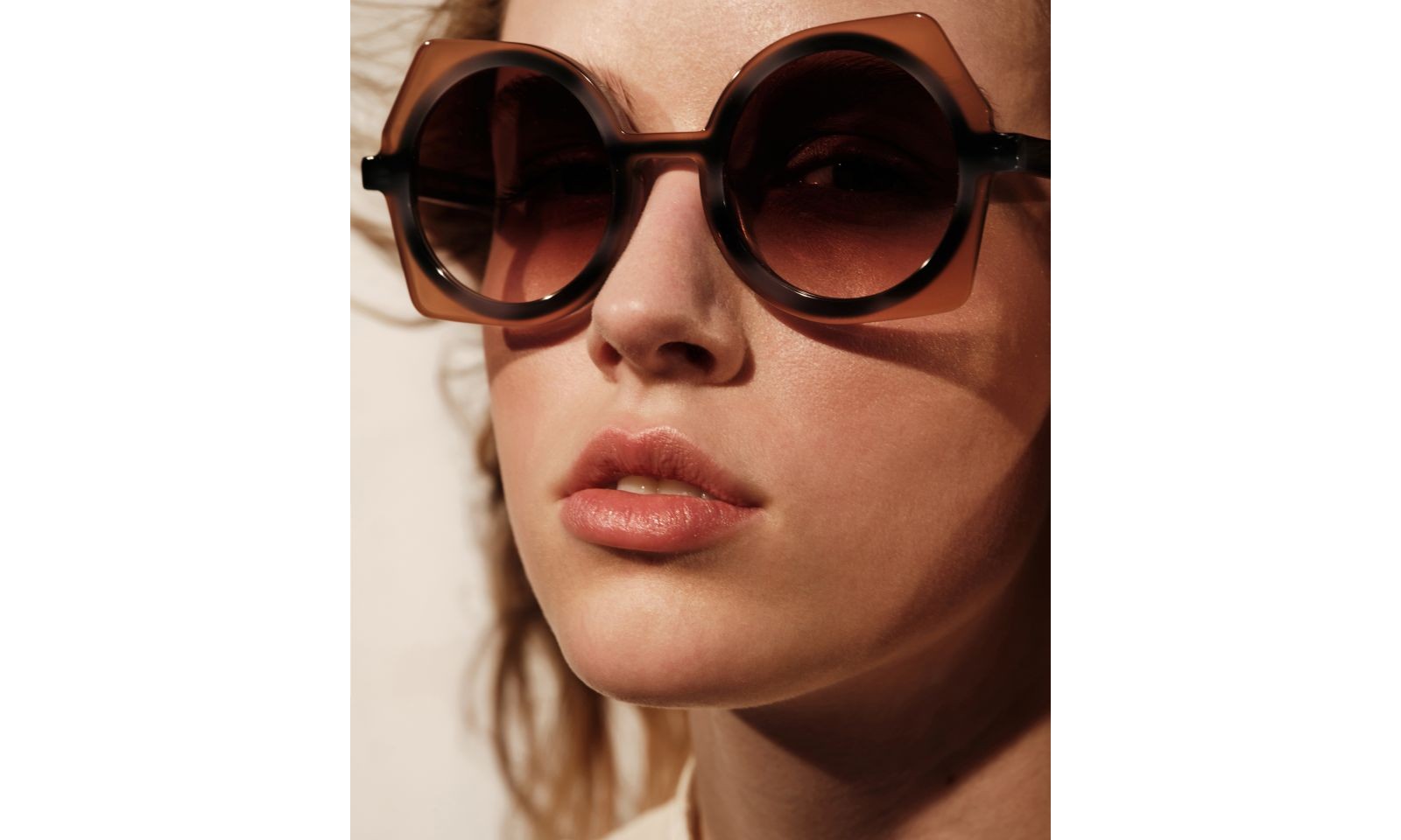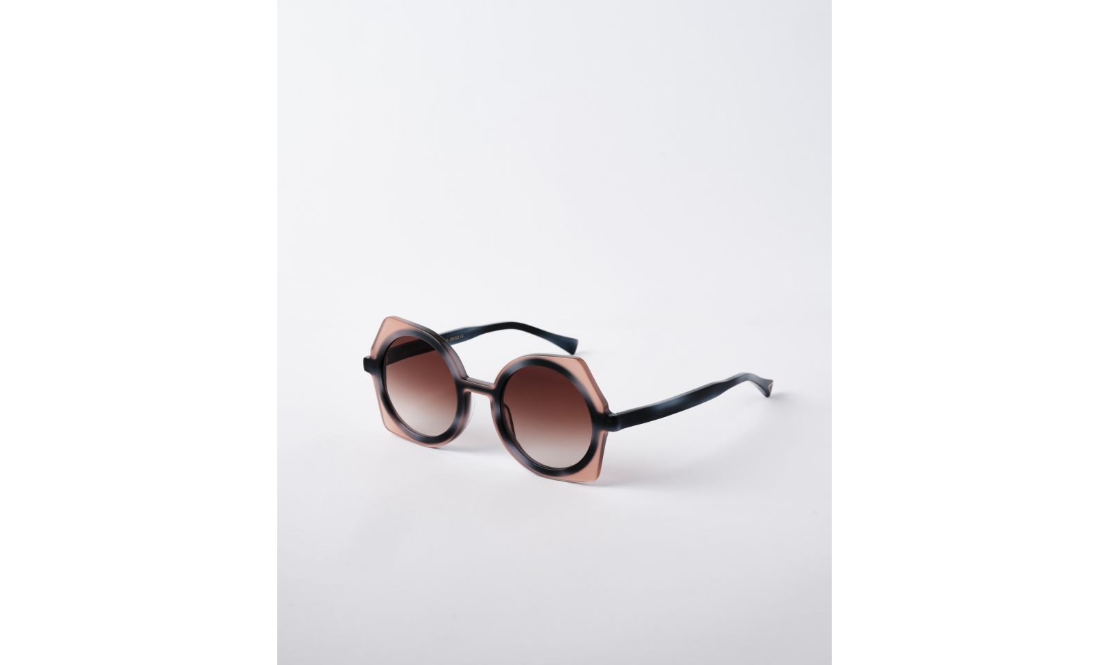 • Γυναικείο γυαλί ηλίου από την ZEUS+DIONE  σε πολυγωνικό πλαίσιο με κυκλικούς φακούς.